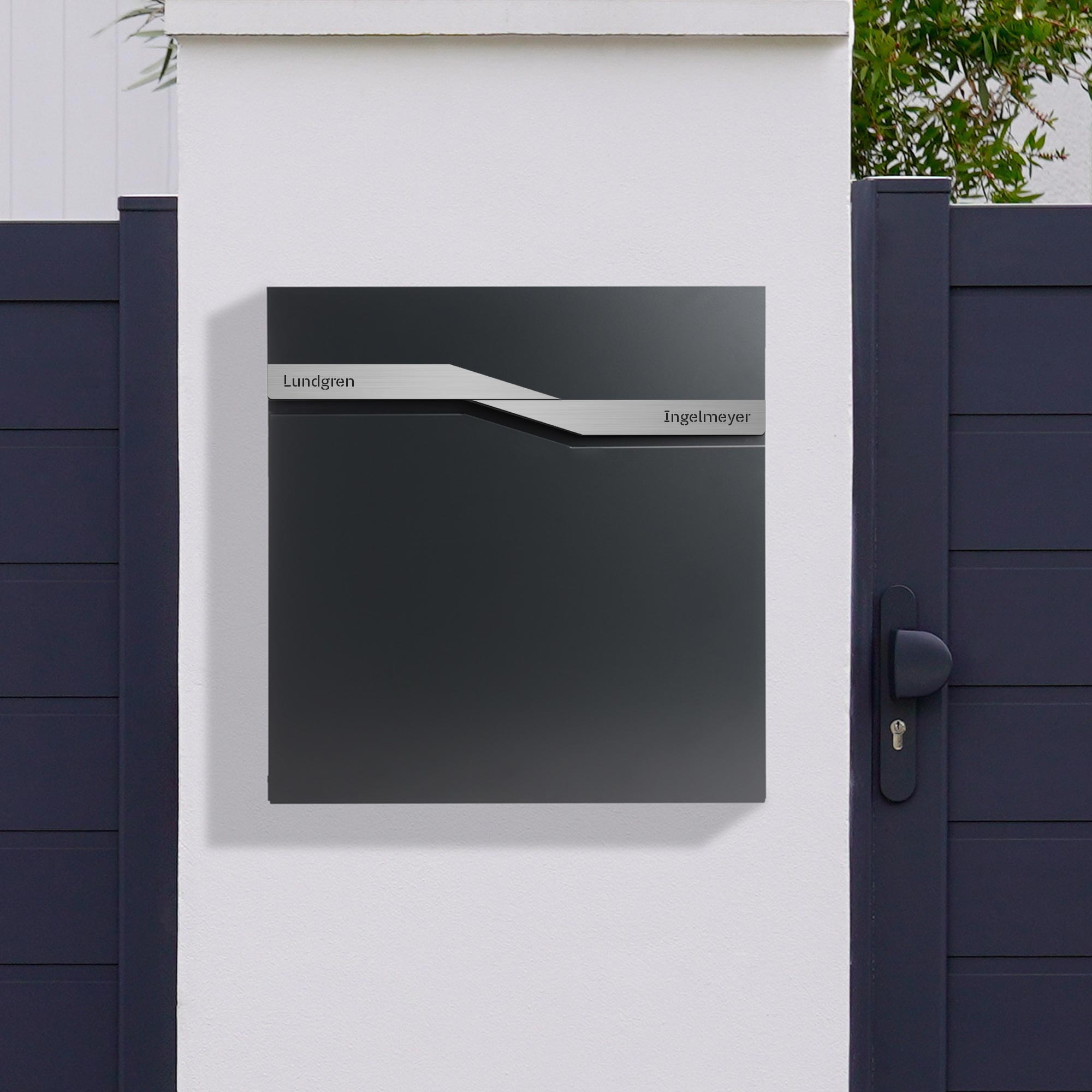Der Briefkasten Trelleborg in modernem Anthrazitgrau (RAL7016) überzeugt durch seine geradlinige Formgebung und funktionale Ausstattung. Aus witterungsbeständigem, pulverbeschichtetem Zinkstahl gefertigt, bietet dieser Wandbriefkasten eine langlebige Lösung für den geschützten Postempfang im Außenbereich. Zwei separat gravierte silberfarbene Plaketten – beide auf der oberen Klappe für die beiden Familiennamen – machen diesen personalisierten Postkasten zu einem echten Blickfang. Neben dem integrierten Zeitungsfach und dem abschließbaren Postfach enthält die Briefbox eine passende Montageschablone, Schrauben und eine "Bitte keine Werbung"-Plakette – für eine einfache und stilvolle Wandmontage.