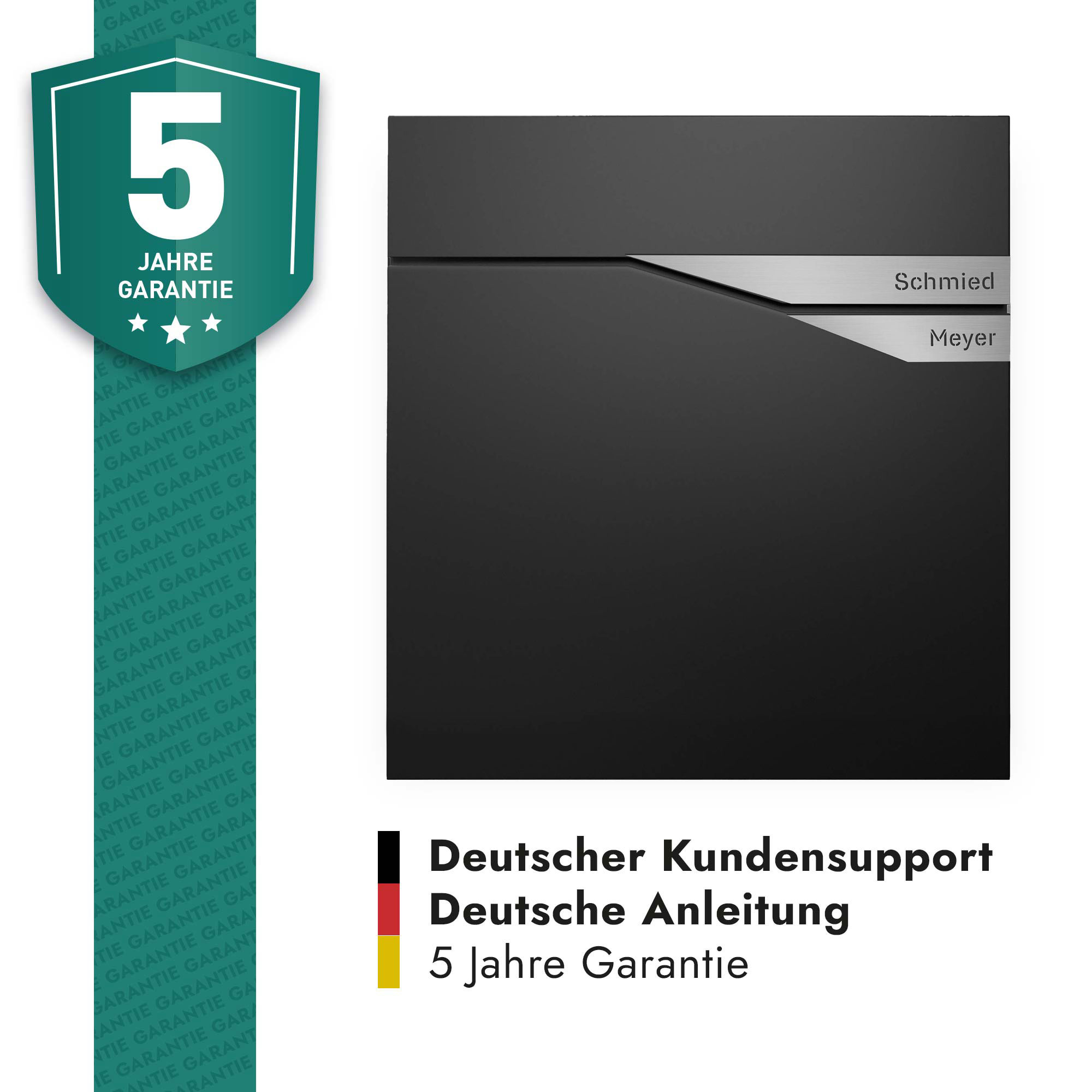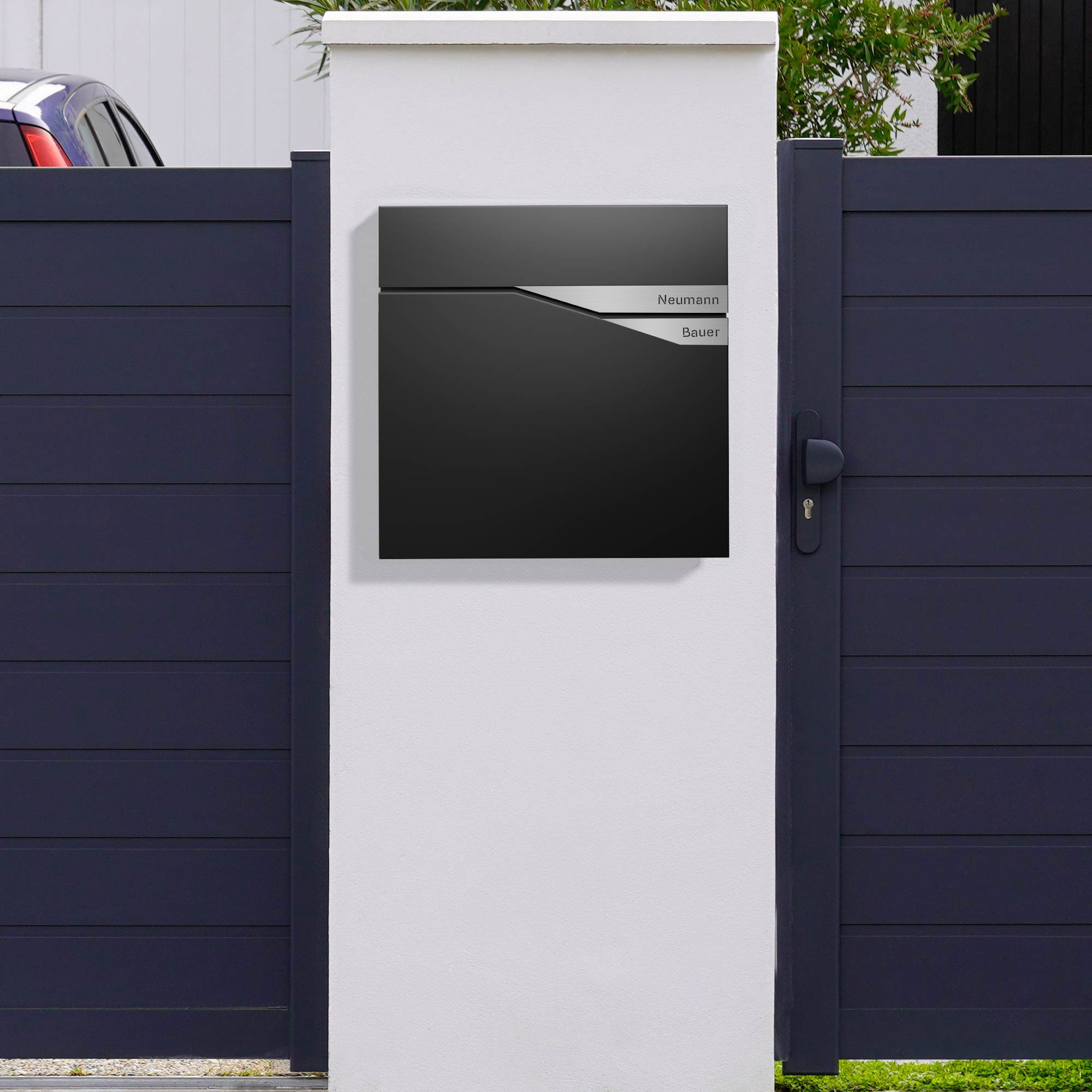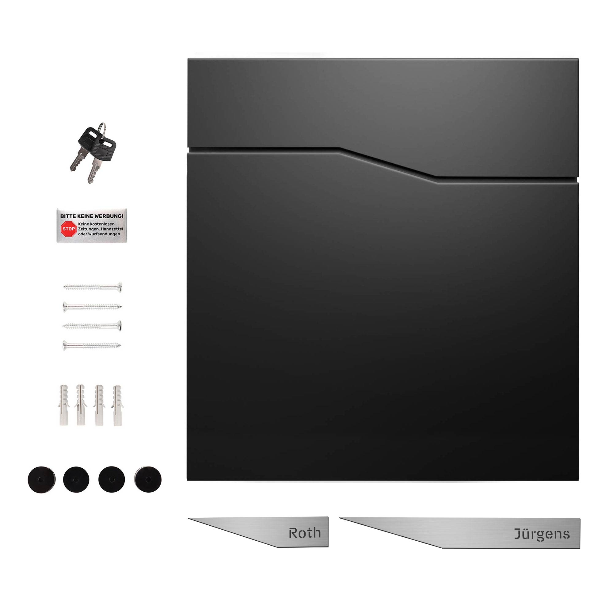 - Personalisierter Namensbriefkasten – Zwei silberfarbene Plaketten, individuell graviert mit Ihren Wunschnamen