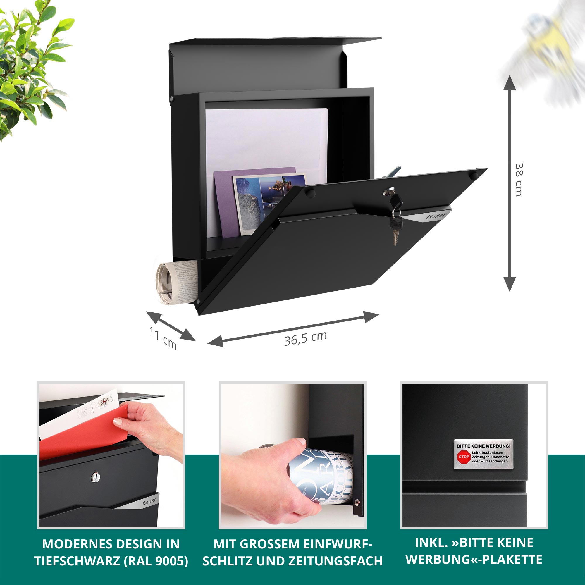 - Zeitungsfach seitlich integriert – Separates Fach für Zeitungen und Werbebeilagen – trocken und ordentlich aufbewahrt