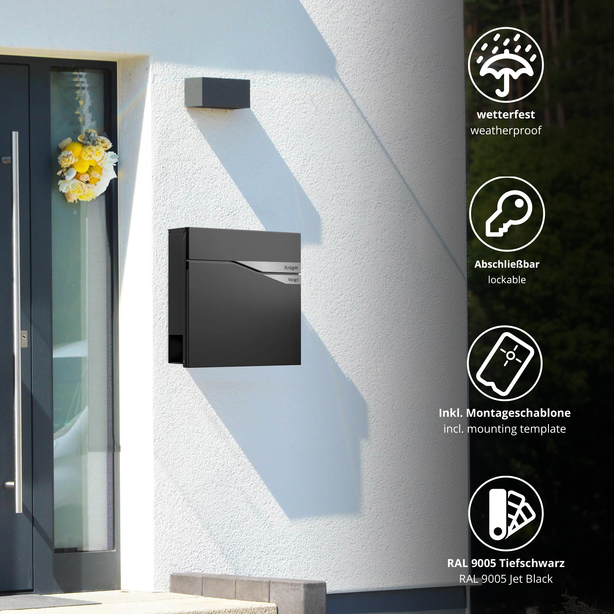 Der Briefkasten Trelleborg in tiefem Schwarz (RAL9005) kombiniert stilvolle Optik mit durchdachter Funktionalität. Zwei silberfarbene Gravurplaketten an der Front bieten Platz für individuelle Namen – ideal für Paare, Familien oder Wohngemeinschaften. Die markante Linienführung und das schlichte Design im skandinavischen Stil machen diesen Wandbriefkasten zu einem eleganten Hingucker an jeder Hausfassade. Der aus Zinkstahl gefertigte Korpus ist pulverbeschichtet und damit wetterfest, rostfrei und besonders langlebig. Für die getrennte Zustellung von Zeitungen ist ein seitliches Zeitungsfach integriert. Eine Montageschablone, passendes Befestigungsmaterial sowie eine Bitte keine Werbung Plakette sind im Lieferumfang enthalten und ermöglichen eine unkomplizierte Wandmontage.
