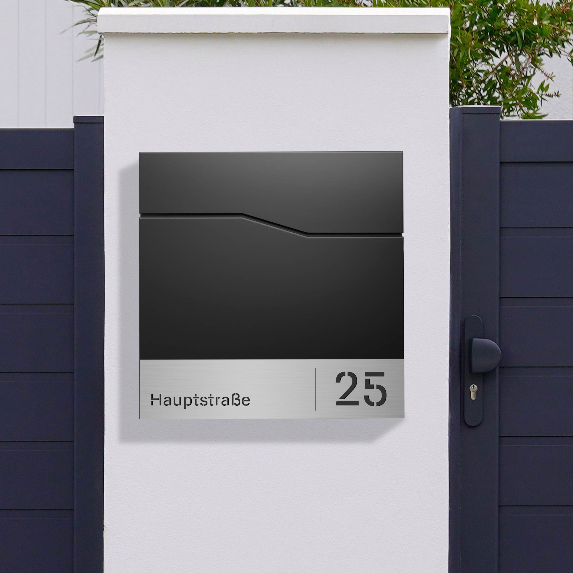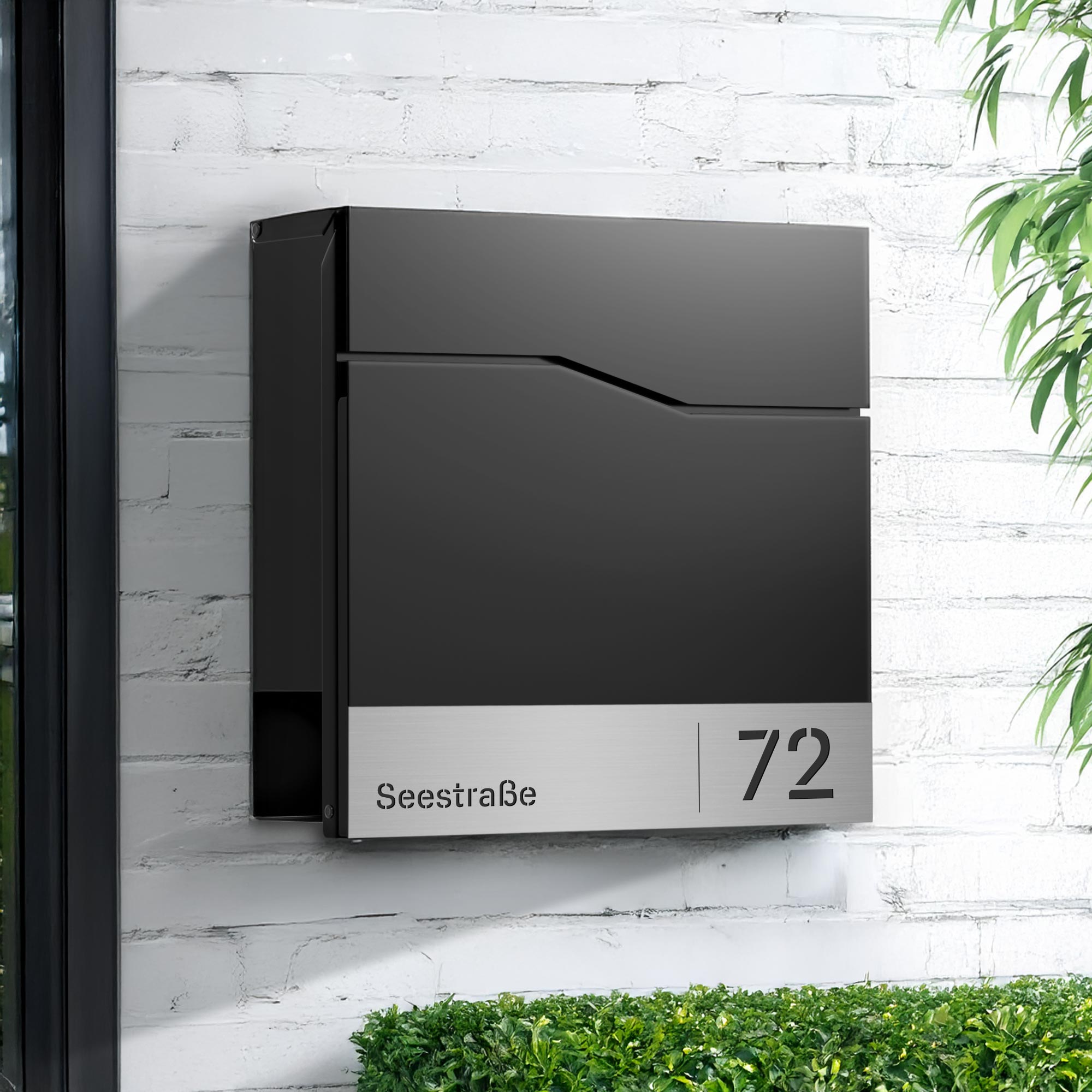 Der Trelleborg Briefkasten in klassischem Tiefschwarz (RAL9005) verbindet zeitlose Gestaltung mit funktionalen Details für den modernen Eingangsbereich. Durch seine minimalistische Silhouette mit markanter Wellenlinie strahlt der Postkasten skandinavische Klarheit aus. Die silberfarbene Plakette auf der Frontfläche des Wandbriefkastens wird individuell mit Ihrem Straßennamen und Ihrer Hausnummer graviert – für eine stilvolle und gut sichtbare Personalisierung. Der pulverbeschichtete Korpus der Briefbox aus rostfreiem Edelstahl ist besonders wetterfest und für den Außenbereich konzipiert. Ein geräumiges Zeitungsfach, das abschließbare Postfach sowie beiliegendes Montagematerial samt "Bitte keine Werbung"-Plakette runden das funktionale Design ab – für alle, die Wert auf Stil, Qualität und Alltagstauglichkeit legen.