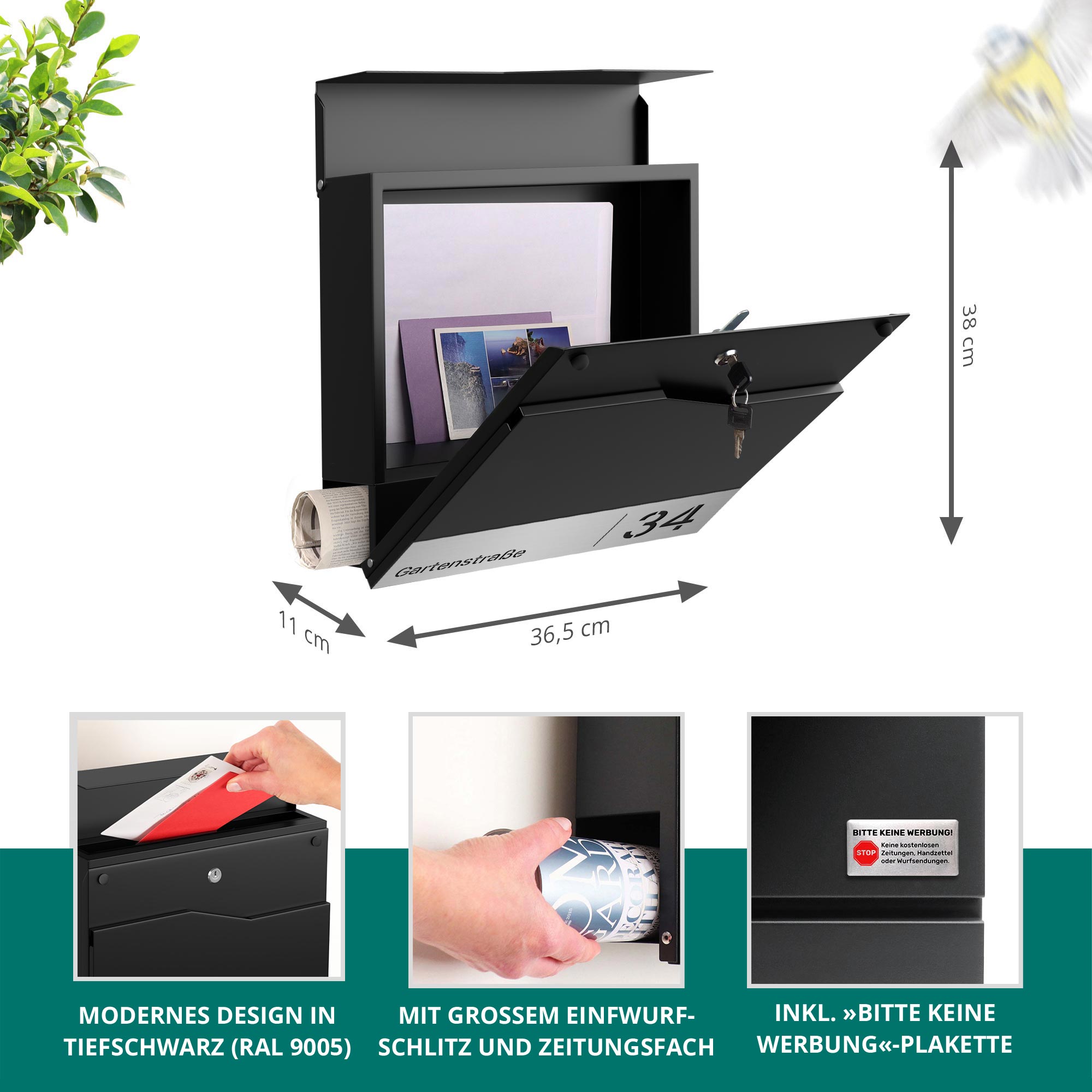 Briefkasten Trelleborg Schwarz (RAL9005) Zinkstahl mit Zeitungsfach - personalisiert mit Hausnummer und Straßenname als Gravur