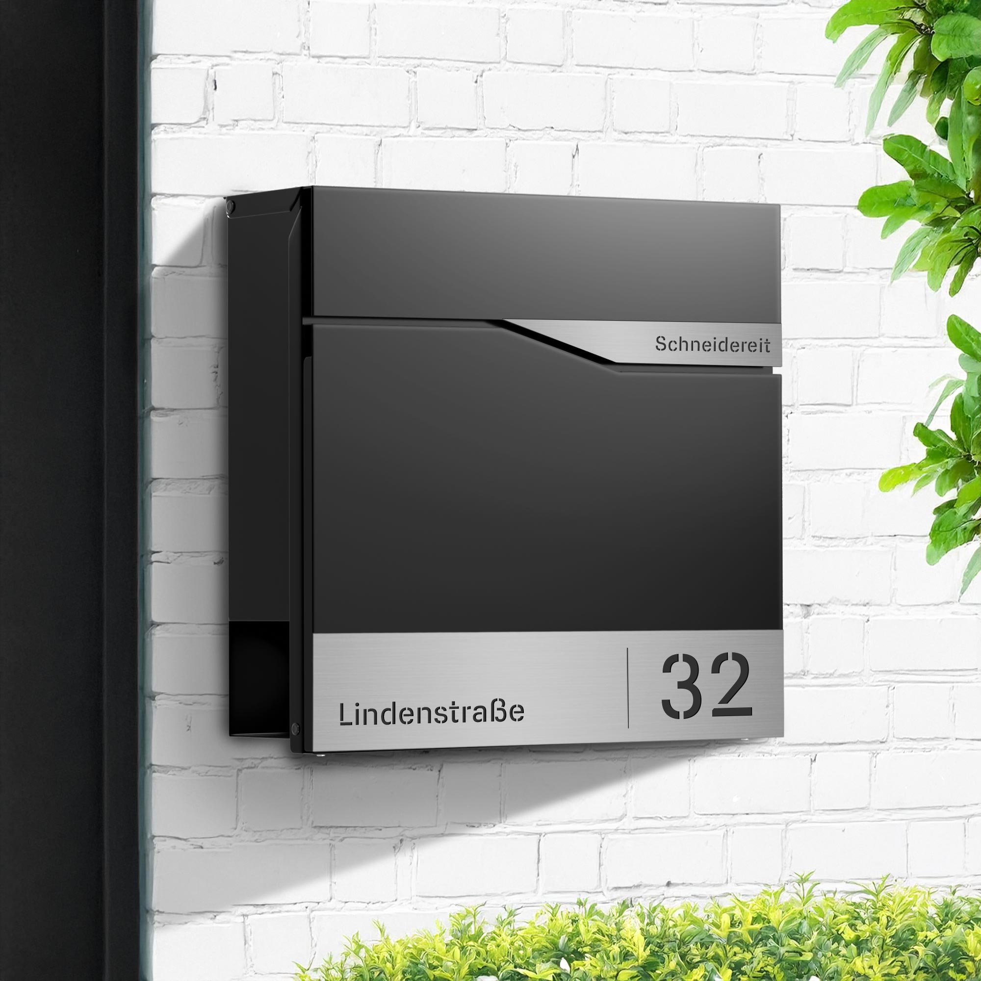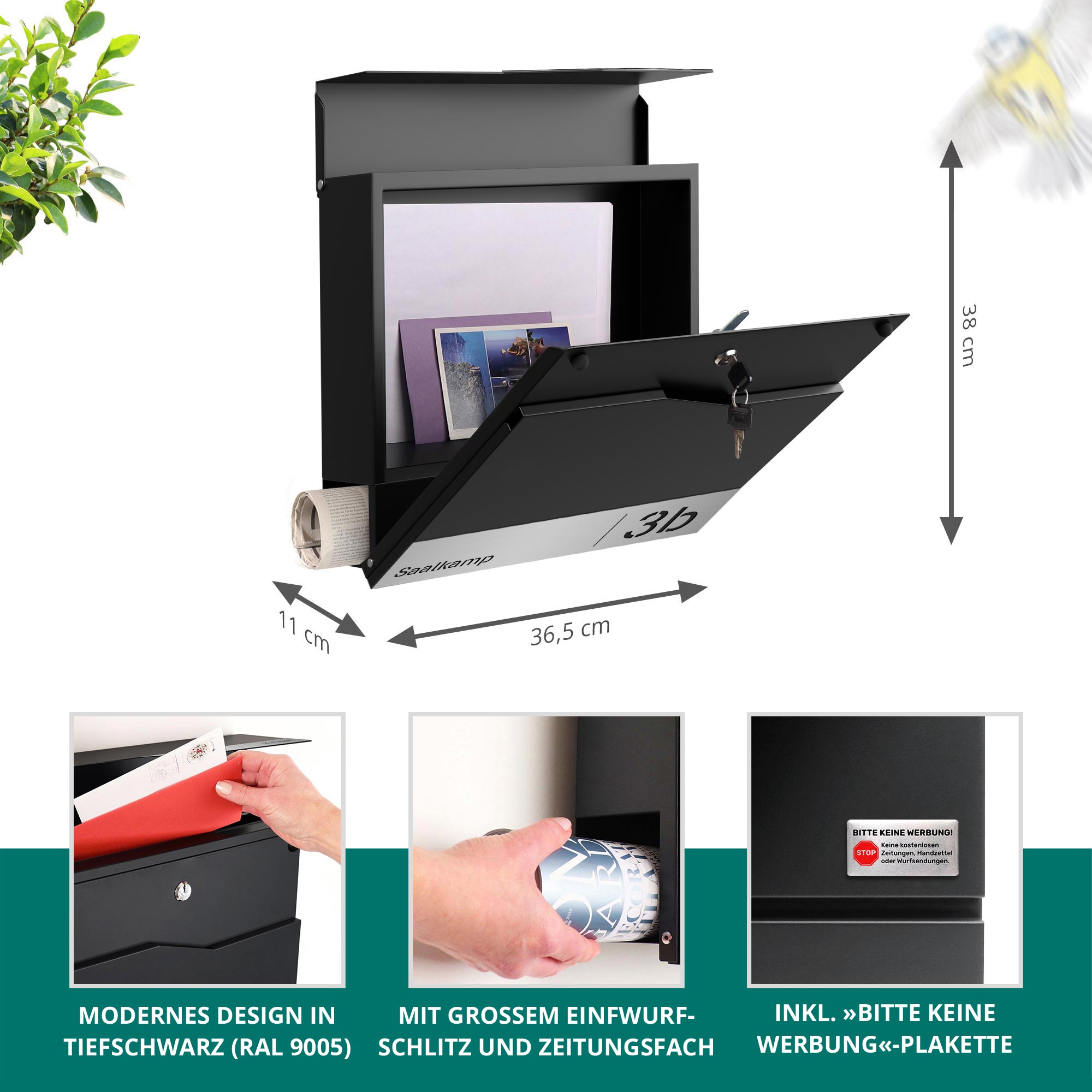 Briefkasten Trelleborg Schwarz (RAL9005) Zinkstahl mit Zeitungsfach - personalisiert mit Namensschild, Hausnummer und Straßennamen als Gravur