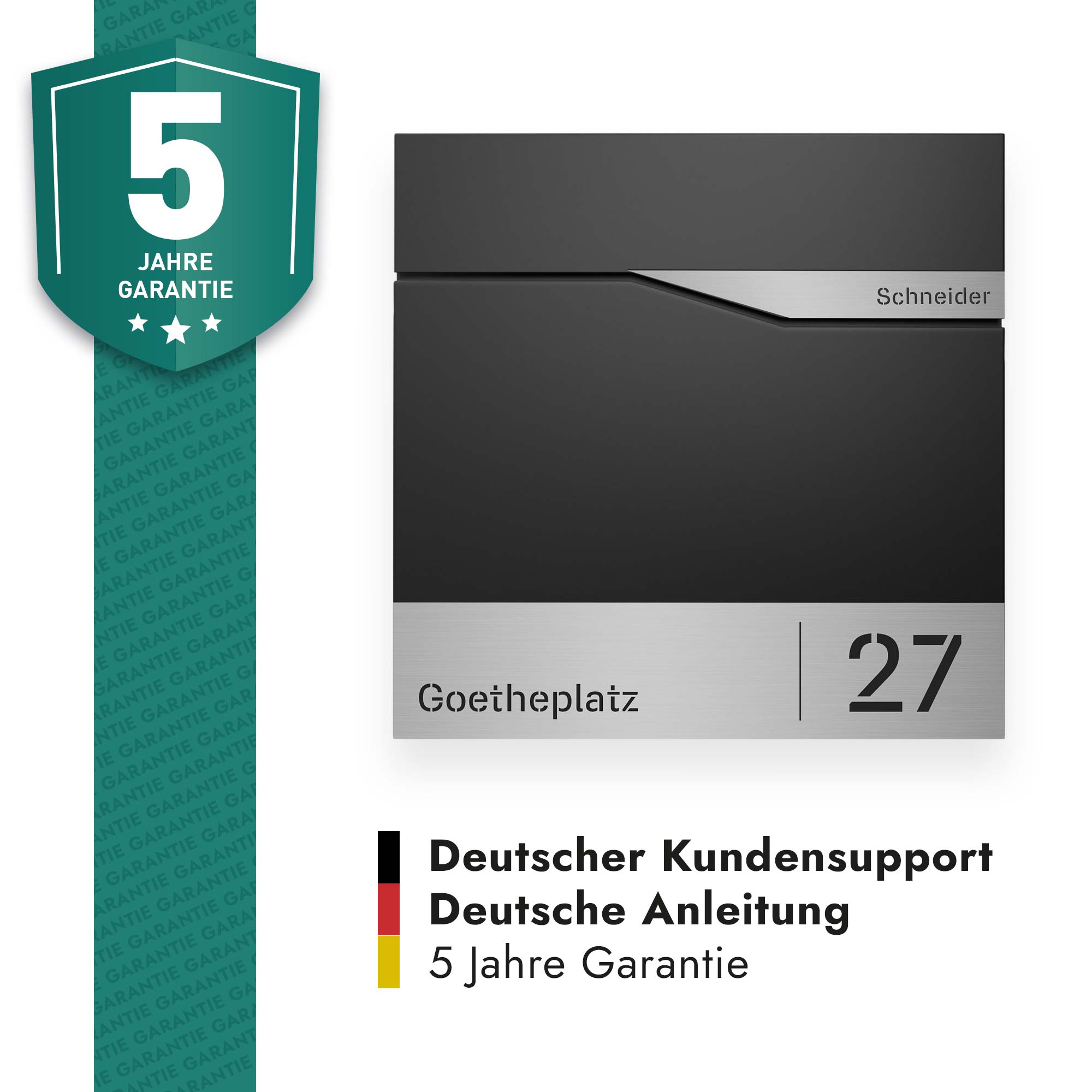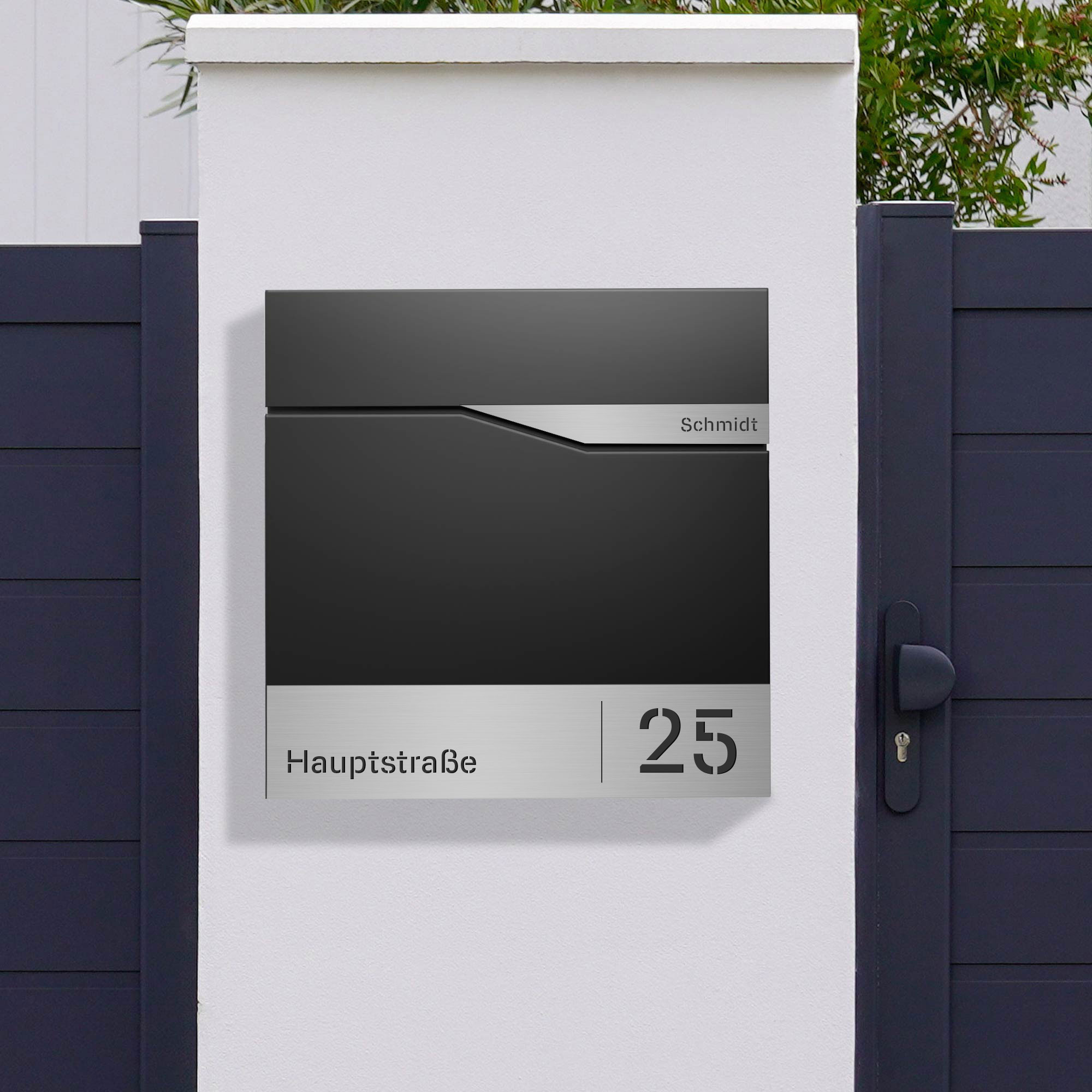 - Personalisierter Briefkasten – Zwei individuell gravierte silberfarbene Plaketten für Nachname sowie Straße und Hausnummer