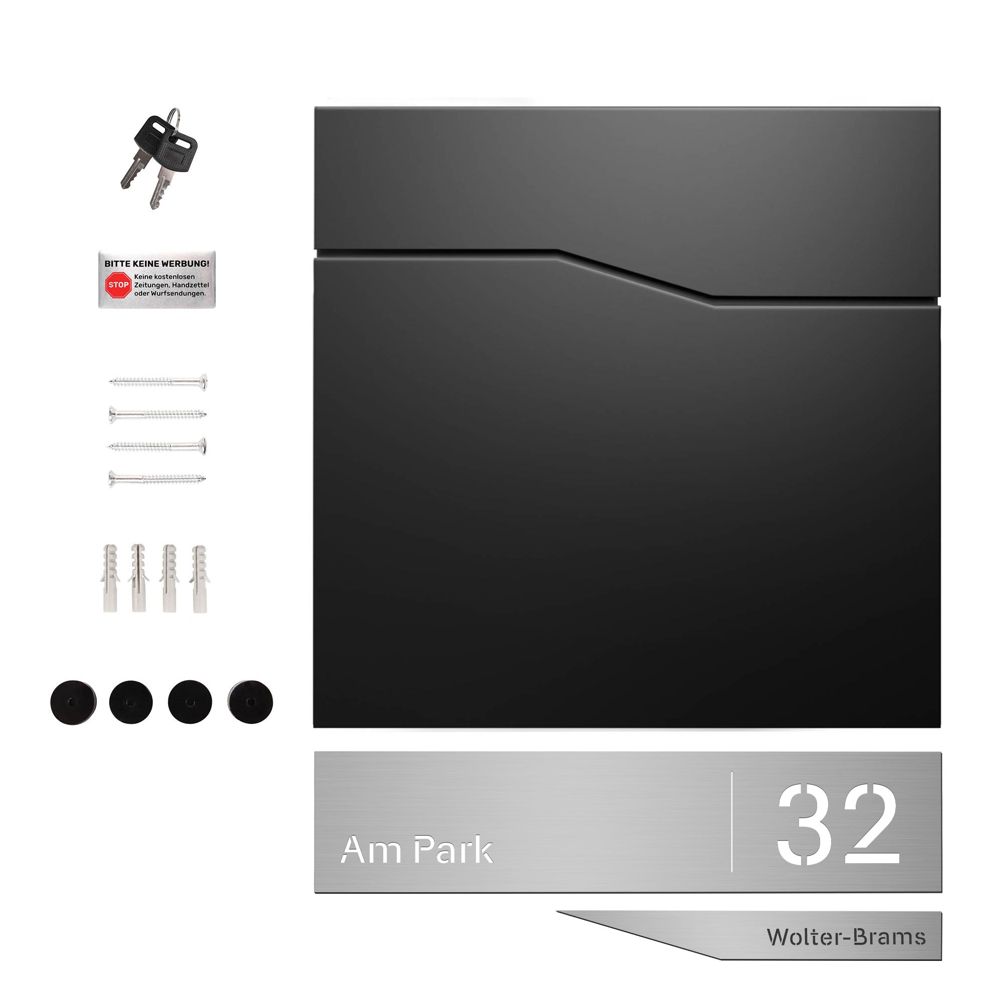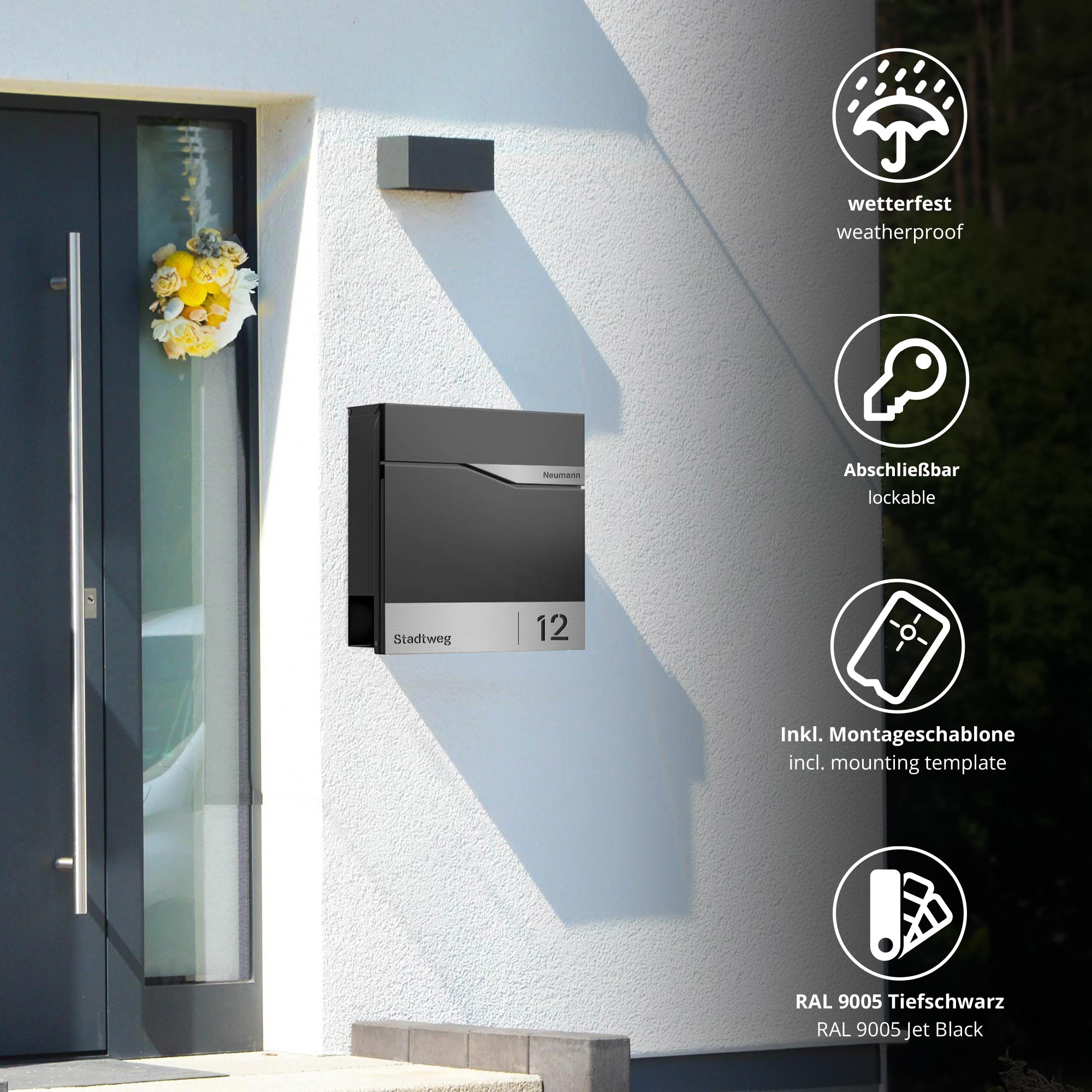 Der Briefkasten Trelleborg in elegantem Tiefschwarz (RAL9005) kombiniert modernes Design mit durchdachter Funktionalität. Zwei silberfarbene Plaketten machen diesen Wandbriefkasten zum echten Blickfang: Oben gravieren wir Ihren Nachnamen – unten Ihre vollständige Adresse inklusive Hausnummer und Straße. So verbinden sich Stil und Orientierung auf besonders hochwertige Weise. Der pulverbeschichtete Korpus aus Zinkstahl ist witterungsbeständig, rostfrei und optimal für den Außenbereich geeignet. Ein integriertes Zeitungsfach sorgt für Ordnung, das abschließbare Fach für Sicherheit. Mit beiliegendem Montageset, Bohrschablone und "Bitte keine Werbung"-Plakette lässt sich der Briefkasten mit Adresse schnell und bequem anbringen – ideal für alle, die Wert auf Qualität, Alltagstauglichkeit und Individualität legen.
