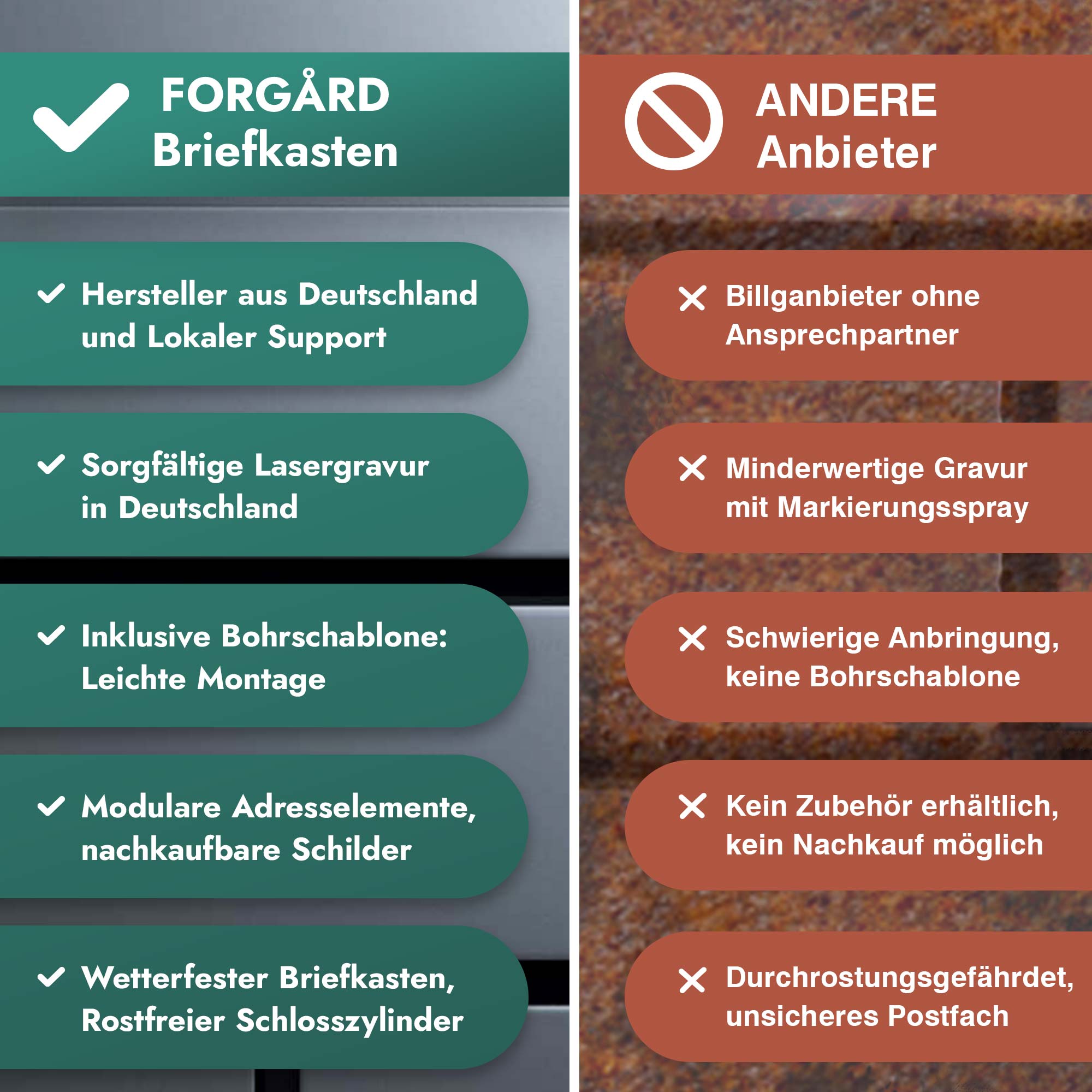Der Viborg Briefkasten mit Namensschild & Adressplakette ist die perfekte Kombination aus nordischem Design, praktischer Ausstattung und individueller Gestaltung. Drei silberfarbene, selbstklebende Plaketten – eine mit Ihrem Familiennamen, eine mit Straßennamen und eine mit der Hausnummer – machen diesen Wandbriefkasten zu einem stilvollen Highlight an Ihrer Hausfassade. Die anthrazitfarbene Oberfläche (RAL7016) wirkt edel und modern, während das wetterfeste Material für Langlebigkeit sorgt. Mit abschließbarem Postfach, separatem Zeitungsfach, Montageset und "Bitte keine Werbung"-Plakette erhalten Sie ein rundum durchdachtes Produkt mit persönlichem Charakter.