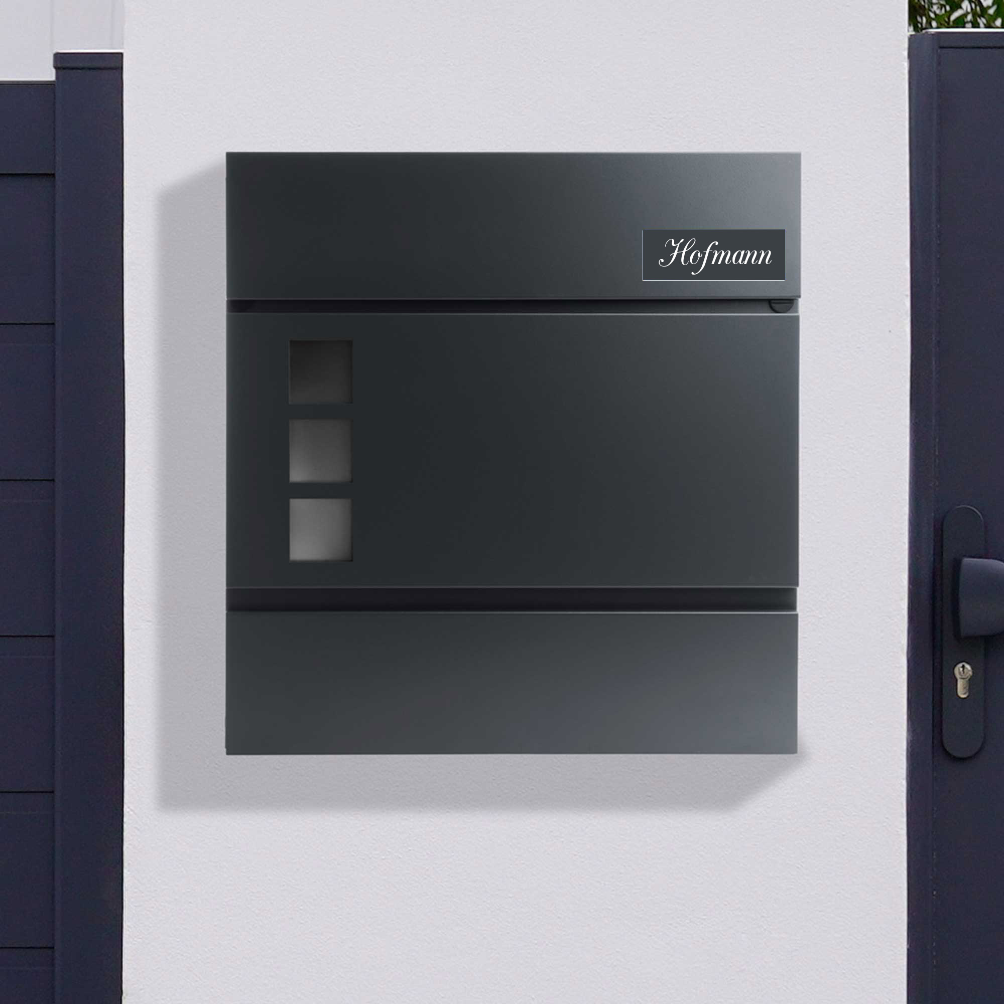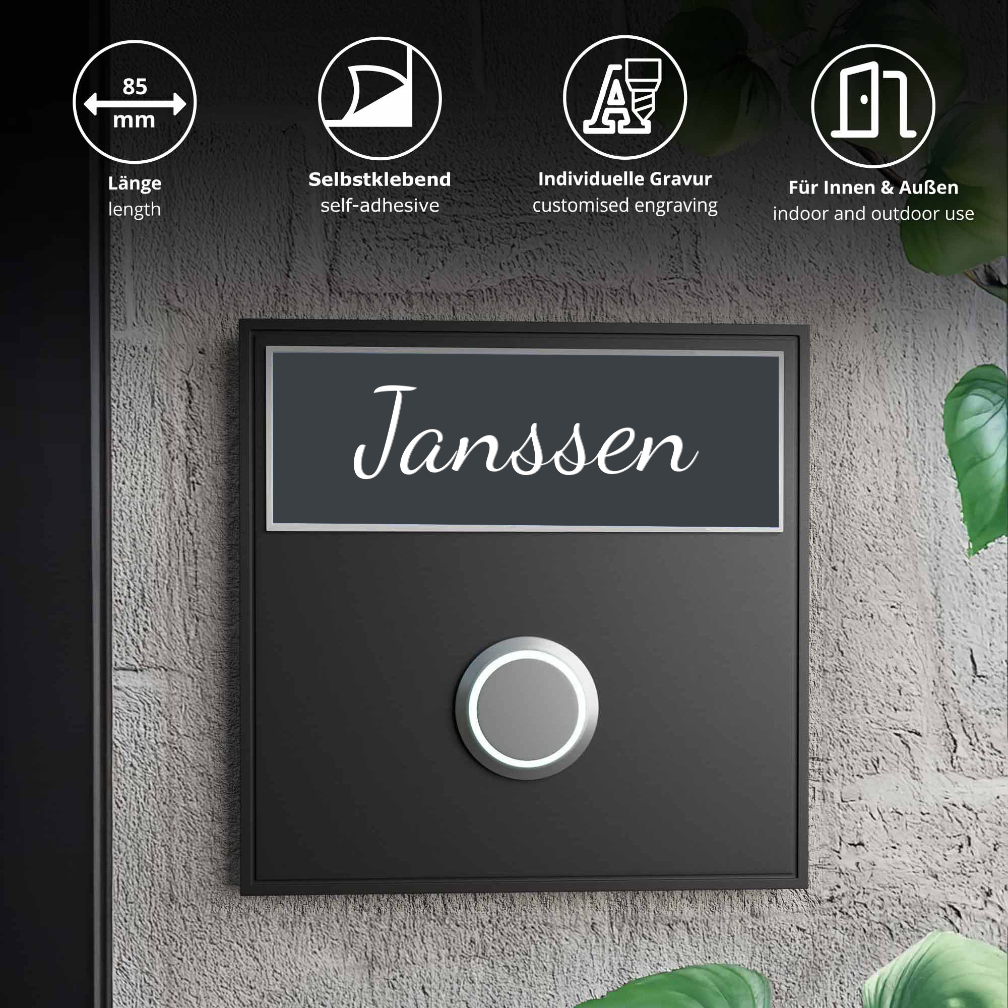 Das Klingelschild Kongsberg in modernem Anthrazit mit weißer Gravur überzeugt durch dezente Eleganz und gute Lesbarkeit. Mit der großzügigen Größe von 85 × 30 mm ist das Türschild perfekt geeignet für Haustüren, Klingeln oder Briefkästen mit mehr Platz. Die individuelle Gravur – wahlweise ein- oder zweizeilig – wird dauerhaft eingearbeitet und hebt sich kontrastreich vom Hintergrund ab. Gefertigt aus hochwertigem, wetterbeständigem 2-Schicht-Acryl, ist das Briefkastenschild sowohl UV-beständig als auch langlebig. Die Montage gelingt mühelos dank der selbstklebenden Rückseite – ganz ohne Bohren. Das Namensschild haftet sicher auf glatten Flächen im Innen- und Außenbereich. Gestalten Sie Ihr individuelles Türschild mit bis zu zwei Gravurlinien, optional abgerundeten Ecken, fünf verschiedenen Schriftarten und auf Wunsch mit einem passenden "Keine Werbung"-Schild. Ein stilvoller, funktionaler Akzent für Ihr Zuhause.