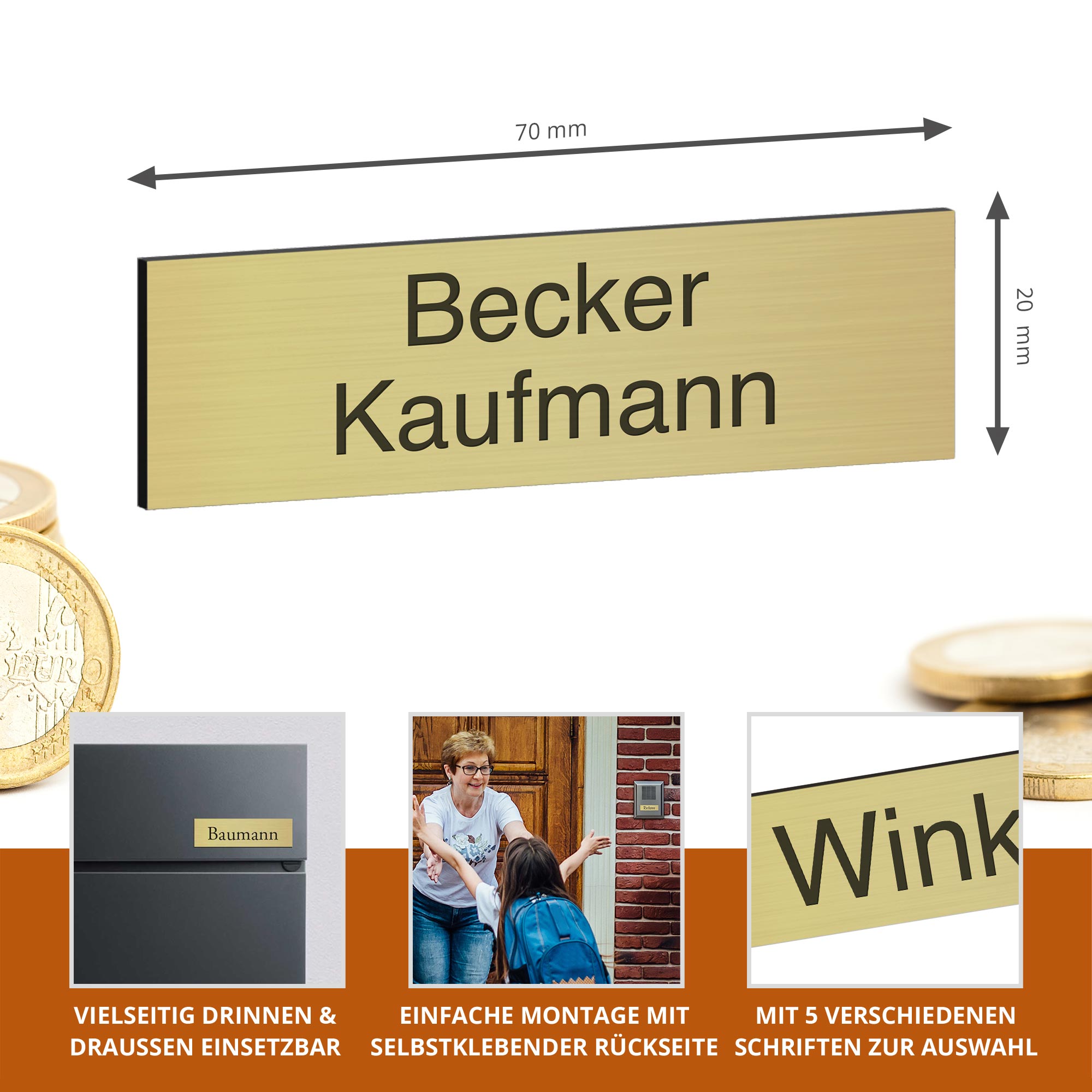 Das Klingelschild Kongsberg in edlem Gold mit schwarzer Gravur vereint klassische Eleganz mit moderner Funktionalität. In der Größe 70x20 mm ist das Türschild kompakt genug für Briefkästen oder Türklingeln und bietet gleichzeitig genügend Platz für Namen, Hausnummer oder beides in einer oder zwei Zeilen. Das Briefkastenschild besteht aus hochwertigem, witterungsbeständigem Acryl (2-Schicht-Material) und eignet sich für den Einsatz im Innen- und Außenbereich. Die individuelle Gravur wird dauerhaft und präzise eingearbeitet – für eine hochwertige Optik, die auch nach Jahren noch überzeugt. Dank der selbstklebenden Rückseite lässt sich das Türschild schnell und sauber anbringen – ganz ohne Bohren. Sie wählen aus fünf modernen Schriftarten, optional abgerundeten Ecken und einem passenden "Keine Werbung"-Schild. Das personalisierte Namensschild ist langlebig, stilvoll und universell einsetzbar.