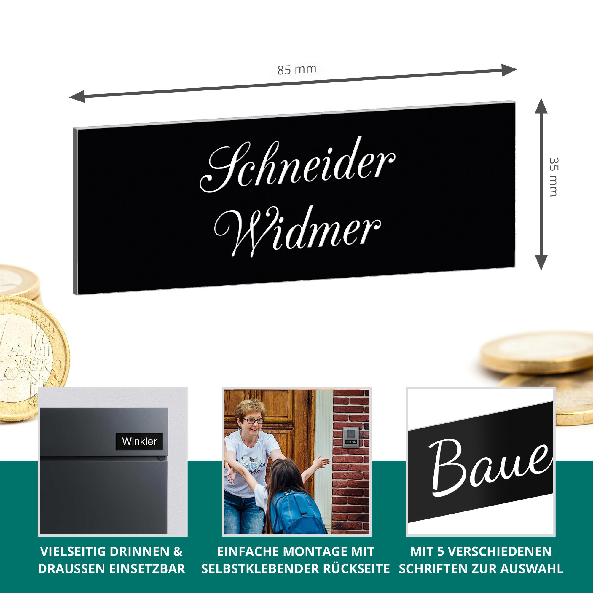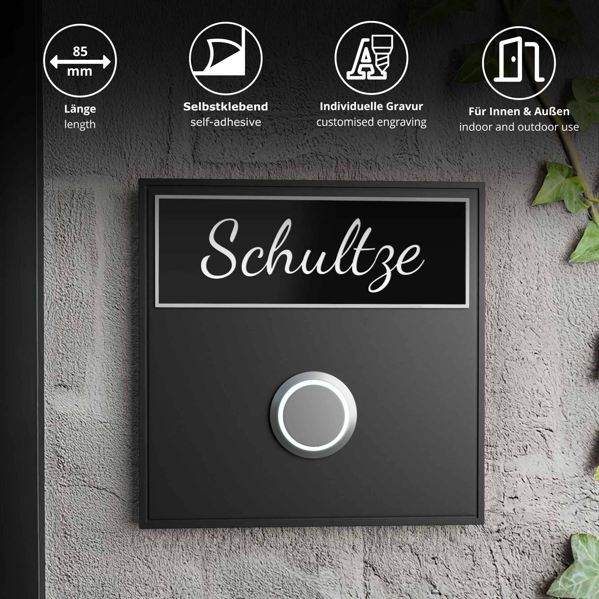 Das Klingelschild Kongsberg in edlem Tiefschwarz mit weißer Gravur steht für zeitloses Design mit starker Lesbarkeit. Mit seiner Größe von 85 × 30 mm eignet sich das moderne Türschild ideal für den Einsatz an Haustür, Klingel oder Briefkasten. Die individuelle Gravur ist in einer oder zwei Zeilen möglich. Gefertigt aus hochwertigem, wetterfestem 2-Schicht-Acryl ist das Namensschild UV-beständig und langlebig – ideal für den Einsatz im Außenbereich. Die helle Gravur hebt sich klar vom dunklen Hintergrund ab und sorgt für ein elegantes Erscheinungsbild. Die Montage gelingt mühelos dank der selbstklebenden Rückseite – ohne Bohren. Wählen Sie aus fünf Gravurschriften, optional abgerundeten Ecken und ergänzen Sie bei Bedarf ein "Keine Werbung"-Schild. Ein stilvolles, funktionales Briefkastenschild für Ihr Zuhause.
